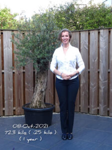 Ik heb Ron ook na mijn traject regelmatig op de hoogte gehouden van de ontwikkelingen betreft mijn traject. Zo kon ik hem na 10 maanden ( augustus 2021 ) vertellen dat ik mijn streefgewicht van 75 kilo had behaald. Ik zou daarna voor een korte periode naar het buitenland gaan… spannend, zou ik aankomen ? Zou ik me aan mijn nieuwe eetgewoonten kunnen houden ? Zou ik daar de producten wel kunnen krijgen die ik hier in Nederland ook gebruik ? Bij thuiskomst wilde ik me persé wegen en wat bleek ? Ik woog 72.3 kilo !!! En dat terwijl ik ook af en toe wel ‘gezondigd’ heb met eten en drinken, maar wel enorm actief ben geweest. Precies 1 jaar nadat ik dit traject ben aangegaan ben ik 25 kilo afgevallen en draag ik maat 40 in plaats van maat 48 /50 en maat M in plaats van XL !!! Wat ben ik trots op mezelf !!! Ik had dit nooit durven denken, maar het kan dus echt.