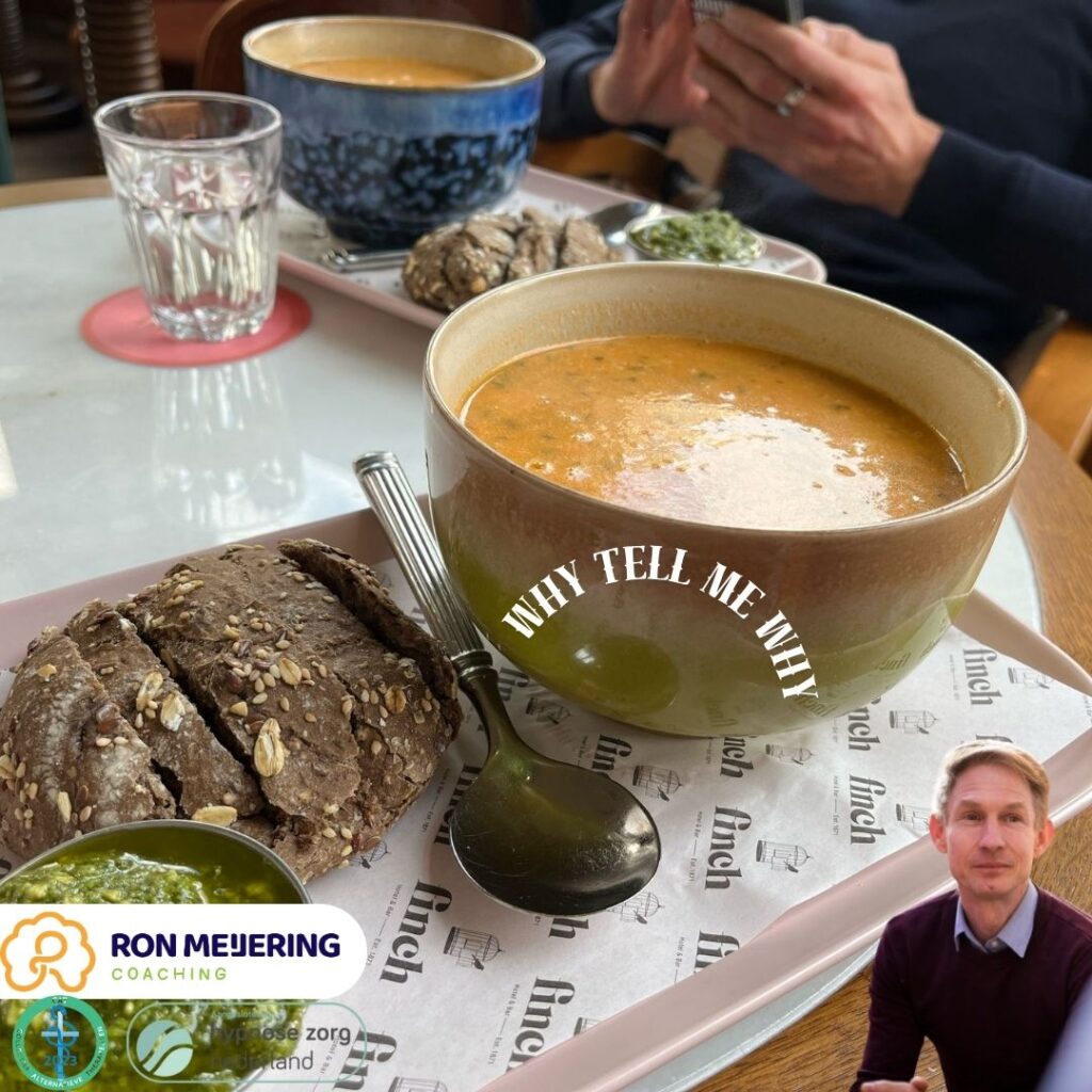 Binnen troffen we een gezellige sfeer, fijne stoelen en écht goede koffie en een lekker soepje. En ja hoor, volgens traditie moest ik weer naar de wc – Arian zegt altijd: “Jij moet altijd naar de wc als je je ergens op je gemak voelt.” 😄
